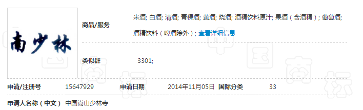 中国嵩山少林寺于2014年11月5日提出注册第15647929号“南少林”商标申请,指定使用在第33类米酒,白酒等商品上。