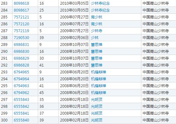 虽然“南少林”的酒类商标被驳回了,但在商标局官网查询后发现,嵩山少林寺不愧是现代化管理的集团。其名下的商标多达542个,包括“少林”、“少林寺”、“东少林”、“少林功夫”等一切跟少林有关的品牌,覆盖了全部45个类别。