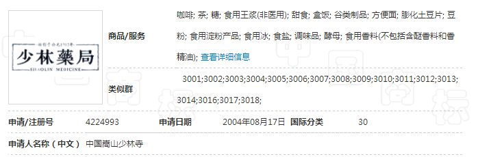 “南少林”并不是少林寺第一个被驳回的商标,此前少林寺也曾有过“少林药局”在30类(茶、咖啡、方便面)被驳回的经历。